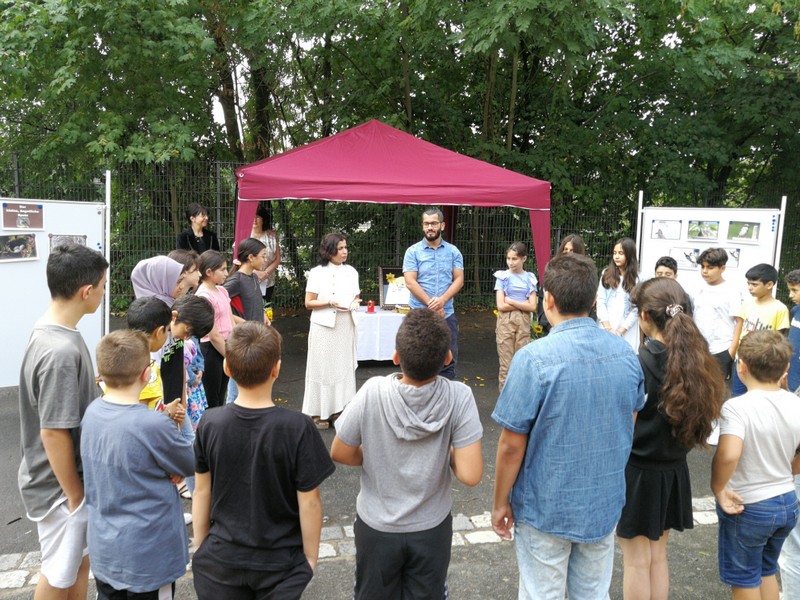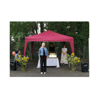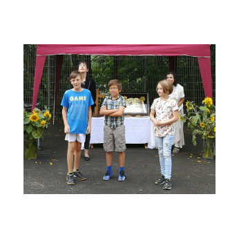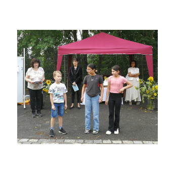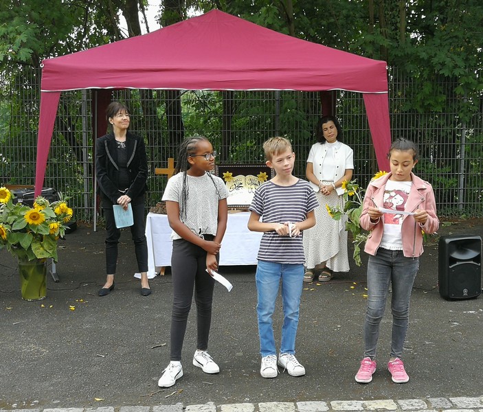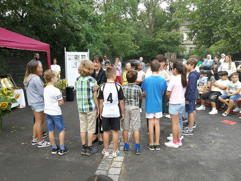 Kein (Turnhallen-)Dach mehr über dem Kopf und Regen gemeldet - nach etwas Umplanen und mit vereinten Kräften war dann doch alles pünktlich fertig. Auch der Regen hatte rechtzeitig aufgehört. So konnte das bewährte Vorbereitungsteam der Religionslehrerinnen die Viertklässler und ihrer Eltern im Hof der Friedrich-Rückert-Schule zur Abschlussfeier begrüßen. Mit selbst formulierten Dankesätzen erinnerten sich die Viertklässler an die vergangenen vier Jahre und sagten "Danke"! Mit der Geschichte vom kleinen, ängstlichen Spatz bekamen sie eine Mutmachgeschichte mit auf ihren neuen Lebensabschnitt, bevor sie mit Gottes Segen, Allahs Zuspruch und vielen guten Wünschen verabschiedet wurden. Frau Campan erhielt ebenfalls ein Dankeschön für ihre zuverlässige und engagierte Arbeit als Elternbeiratsvorsitzende.