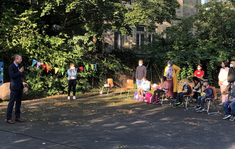 Bunte Schultaschen, große Schultüten, aufgeregte Erstklässler... endlich war er da: Der erste Schultag. Bei strahlendem Sonnenschein wurden die frischgebackenen ABC-Schützen dieses Jahr im festlich geschmückten Pausenhof in drei „Schichten“ von Schulleiterin Sabrina Neckov herzlich begrüßt und von den beiden zweiten Klassen musikalisch willkommen geheißen, bevor sie anschließend in ihren ersten Schultag starten durften.