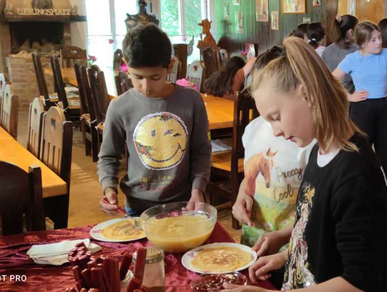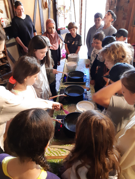 Die Klassen 4a, 4b und 4c fuhren mit dem Bus zur Umweltstation Reichelshof in Sennfeld. Im Rahmen des Projektes "Vom Korn zum Brot" erhielten die Kinder viele anschauliche Informationen: Welche Getreidesorten wachsen bei uns? Welche Maschinen helfen bei der Ernte? Anschließend durften die Schüler und Schülerinnen sich selbst einen Pfannkuchen zubereiten - und natürlich auch mit Aufstrich nach Wahl verspeisen! Daneben blieb auch noch Zeit die zahlreichen Tiere zu besuchen.
