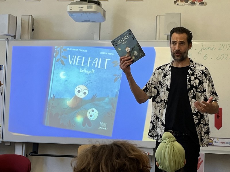 Alexander, selbst Vater von zwei Kindern, las in den ersten und zweiten Klassen die Geschichte vom Glühkäfermädchen Rosalie vor. Ihr sehnlichster Wunsch war es, nicht nur jede Nacht die Wies mit allen anderen Glükkäfermädchen mit ihrem Lich zu verzaubern. Sie wollte auch - wie die Glühkäferjungen - über die Wiese fliegen. Kann ihr Traum in Erfüllung gehen?