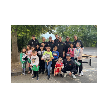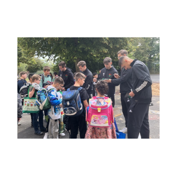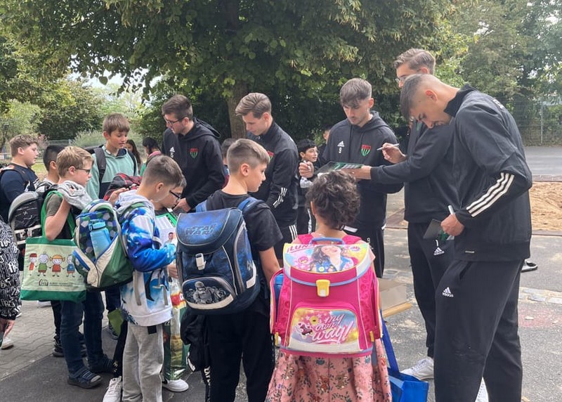 Endlich war er da: Der erste Schultag. Bei strahlendem Sonnenschein wurden die frischgebackenen ABC-Schützen dieses Jahr alle zusammen im Pausenhof von Schulleiterin Sabrina Neckov herzlich begrüßt und von Klasse 2a und 2b mit ihren Klassenlehrerinnen Frau Bankmann und Frau Freunek musikalisch willkommen geheißen. Anschließend starteten die Schulanfänger in ihren ersten Schultag. Während die Kinder bei ihrer ersten Schulstunde weilten, "versüßte" der Elternbeirat die Wartezeit für die Eltern mit Kaffee und Kuchen. Als um 11 Uhr der erste Schultag zu Ende war, überraschten einige Spieler der "Schnüddels" die ABC-Schützen im Pausenhof.