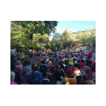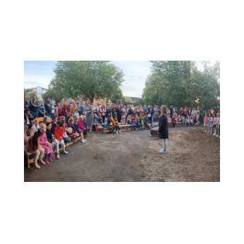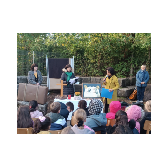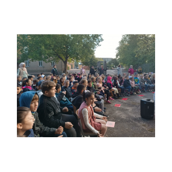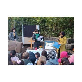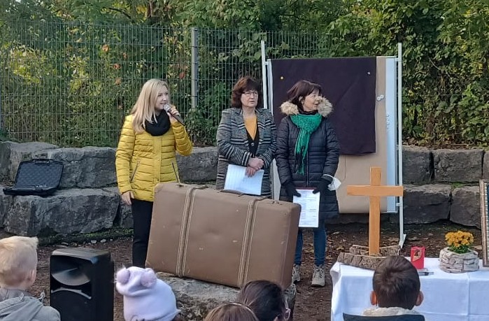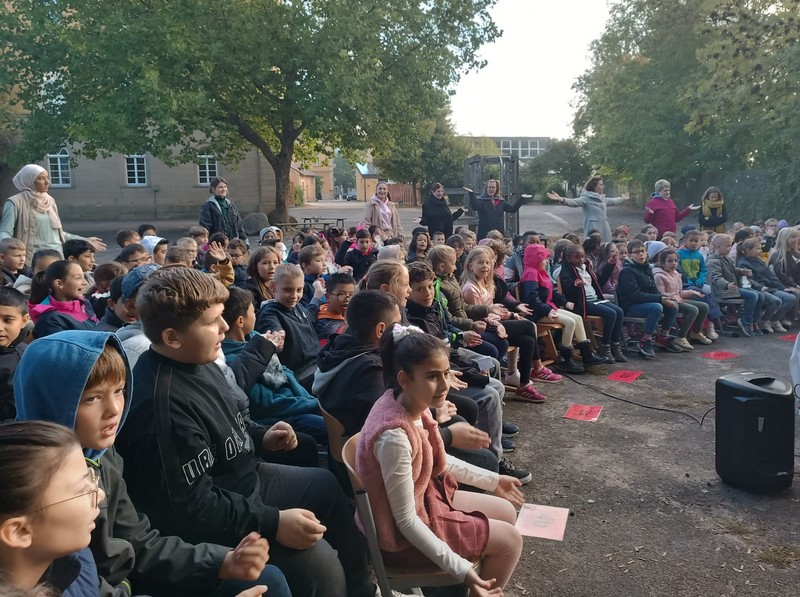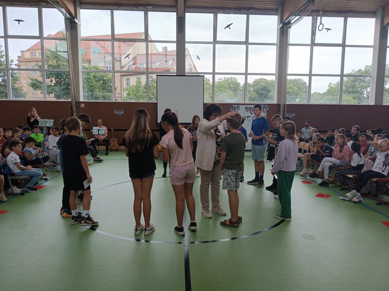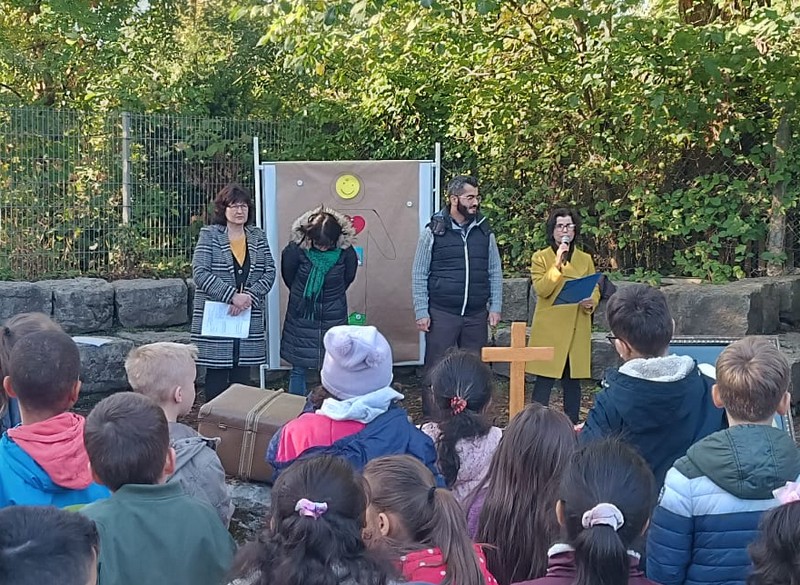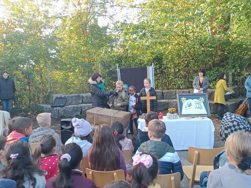 Zur gemeinsamen multireligiösen Anfangsfeier versammelte sich die ganze Schulfamilie dieses Jahr im Pausenhof, da die Turnhalle wegen der Sturmschäden noch nicht benutzbar war. Bei strahlendem Sonnenschein begrüßte Schulleiterin Frau Neckov alle Schülerinnen und Schüler sowie die Lehrkräfte der Friedrich-Rückert-Schule ganz herzlich und dankte dem bewährten Team unter anderem den Religionslehrerinnen Frau Cetinkaya, Frau Gobs-Knoche und Frau Kneuer für die Vorbereitung, dem Lehrerorchester für die gelungenen musikalische Untermalung und allen Lehrkräften und Kindern, die mit dieser besonderen Feier wieder einmal gezeigt haben, das Lernen und Feiern auch über verschiedene Kulturen und Religionen hinweg möglich ist. Der riesengroße Koffer knüpfte direkt an die Abschlussfeier vor den Sommerferien an. Vier Kinder berichteten, wie sie die Ferientipps umgesetzt hatten. Anschließend wurden die Erstklässler auch ganz offiziell in der Schulgemeinschaft begrüßt.