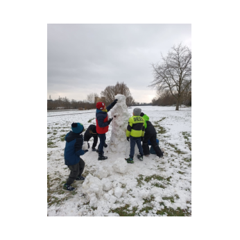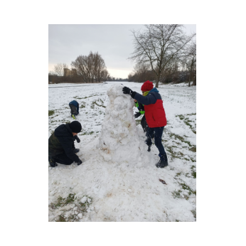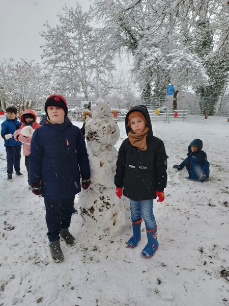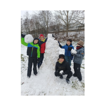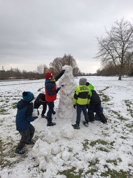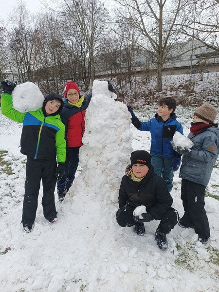 ...endlich richtig schöner Pappschnee! In kürzester Zeit erschufen viele fleißige Kinderhände kleine, große und extragroße Schneemänner und -frauen und auch ein Schneeschaf!