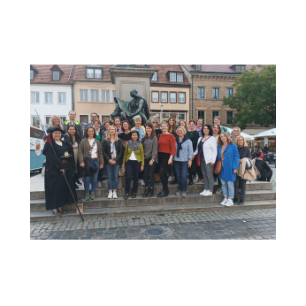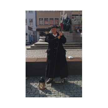 Beim diesjährigen Lehrerausflug begleitete das Team der Friedrich-Rückert-Schule sowie einige Ehemalige die Frau des Nachtwächters auf ihrer Runde durch das mittelalterliche Schweinfurt. Da ihr Mann Wein und Schnaps mehr liebt als sie, machte sie sich an seiner Stelle auf, um nach dem Rechten zu sehen. Dabei plauderte das Schweinfurter Original kurzweilig und erfrischend über alte Zeiten, bemerkenswerte Gebäude und deren Bewohner. Nach dem gemeinsamen Gruppenbild dankte Rektorin Neckov für die interessante Führung und überreichte der Stadtführerin Frau Grimm als kleines Dankeschön ein Glas Original-Friedrich-Rückert-Schul-Honig. Nach dem Ausflug in die Vergangenheit klang der Tag bei einem gemeinsamen Abendessen aus.