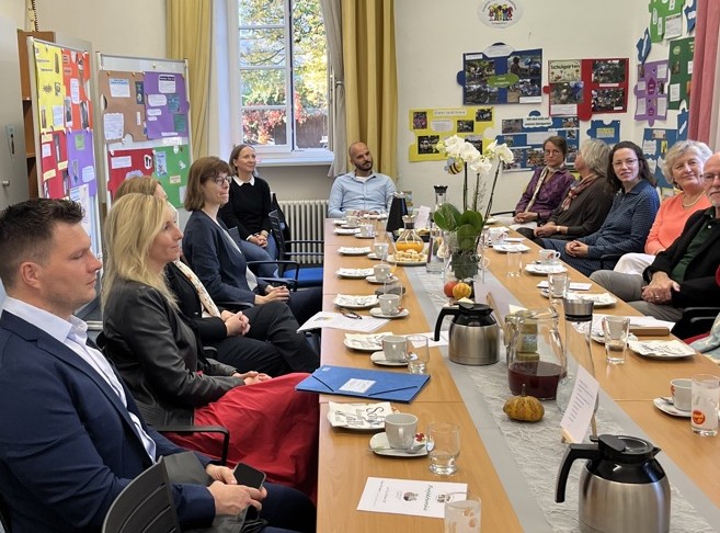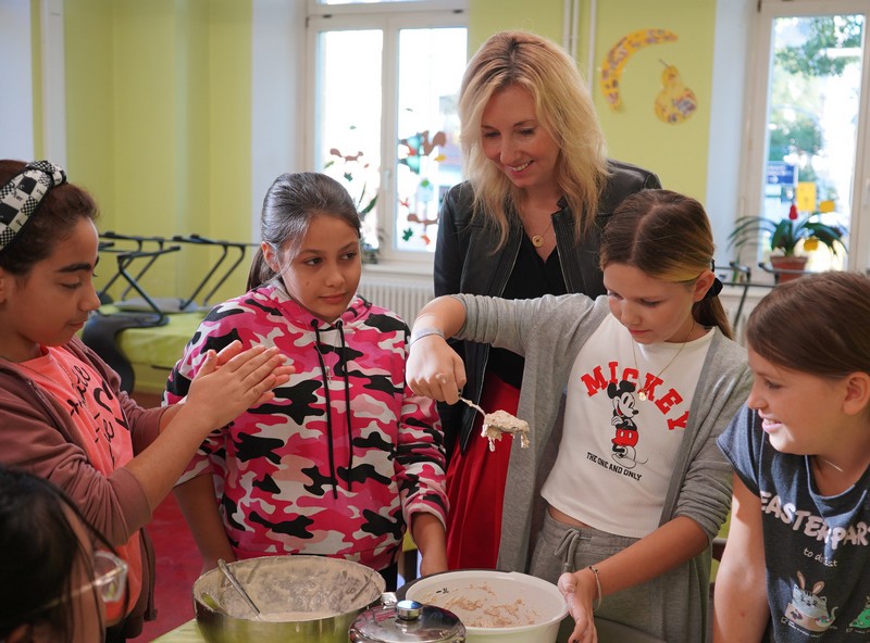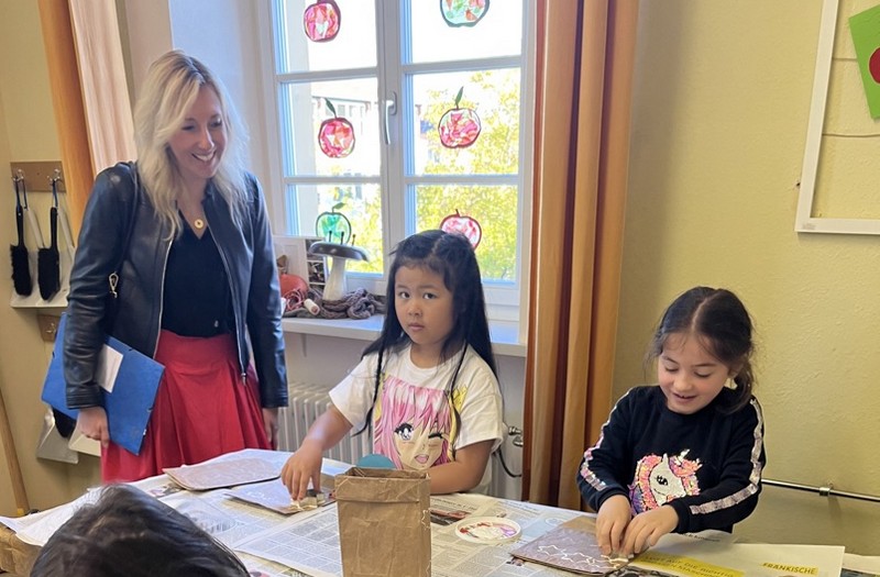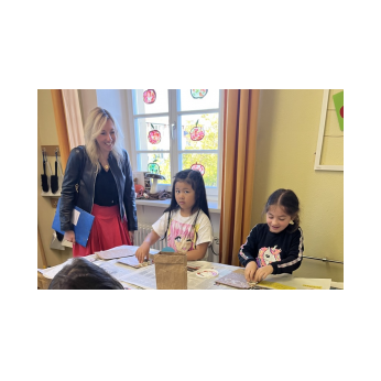 Zum offiziellen Startschuss der "Woche der Gesundheit und Nachhaltigkeit" kam Kultusstaatssekretärin Anna Stolz zu uns an die Friedrich-Rückert-Grundschule. Diese bayernweite Aktion steht unter dem Motto "zusammenWachsen" und verfolgt das Ziel, dass Schülerinnen und Schüler selbst aktiv werden und bei Workshops und Aktionen Erfahrungen und Wissen zu den Themenbereichen Natur, Umwelt und Zusammenleben sammeln und vertiefen können. Schulleiterin Sabrina Neckov gab der Staatssekretärin zunächst im Lehrerzimmer einen kurzen Überblick über unsere Schule und die geplanten Vorhaben der Projektwoche. Danach durfte Anna Stolz selbst ihr Geschick an einer Taststation des Sinnespfades unter Beweis stellen. Anschließend überzeugte sich die Staatssekretärin bei kurzen Stippvisiten, mit wie viel Freude und Interesse die Kinder bei den Aktionen "Brotbacken" und "Upcycling von Brotzeittüten" bei der Sache waren. Sowohl die Staatssekretärin als auch Dr. Christiane Brunner vom Kompetenzzentrum für Ernährung zeigten sich äußerst beeindruckt von der