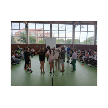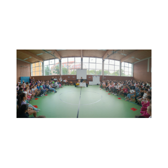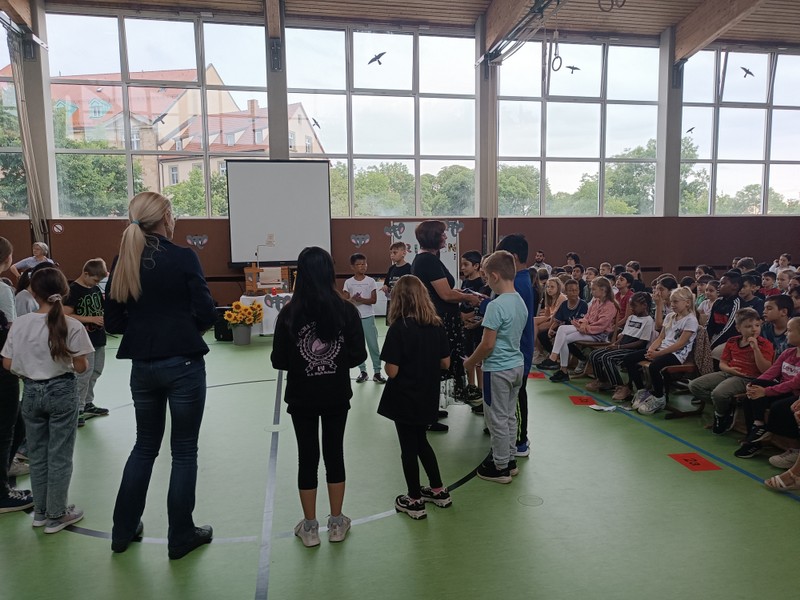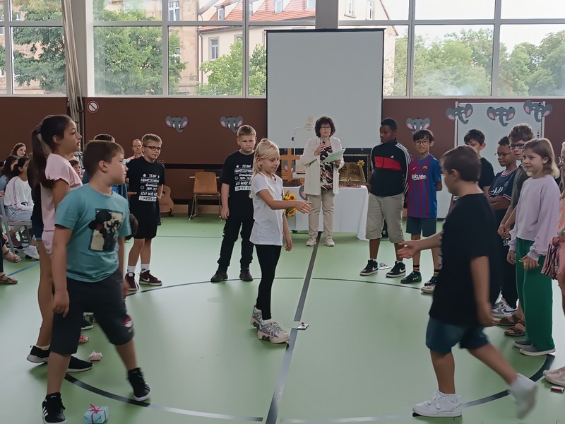 Am letzten Mittwoch im Schuljahr trifft sich tradiotionell die ganze Schulfamilie in der Turnhalle, um gemeinsam die Viertklässler zu verabschieden, auf das vergangene Jahr zurückzublicken und "Danke" zu sagen. Nach der Begrüßung durch Konrektorin Tanja Kärpf entführten uns die Kinder der katholischen Religionsgruppe 3/4 unter Leitung von Frau Kneuer in die Welt der Elefanten. Auch bei den großen Dickhäutern gibt es Streit - und auch Versöhnung! So war der Frieden bald wieder hergestellt. Zum Thema Frieden brachten die Kinder zusammen mit Frau Gobs-Knoche ihre eigenen Gedanken ein. Dann wurde es Ernst: Immer sehr emotional bewegend bekommen die Viertklässler von ihren Lehrkräften einen guten Wunsch oder Gottes Segen mit auf den Weg. Unser engagierter Elternbeirat erhielt als symbolisches Zeichen seiner tollen Arbeit ebenfalls ein Dankeschön in Form einer Sonnenblume. Nach der Feier wurden die Viertklässler durch ein Spalier bestehend aus allen Kindern "hinausgekehrt"!
