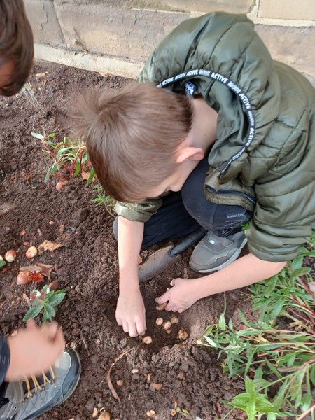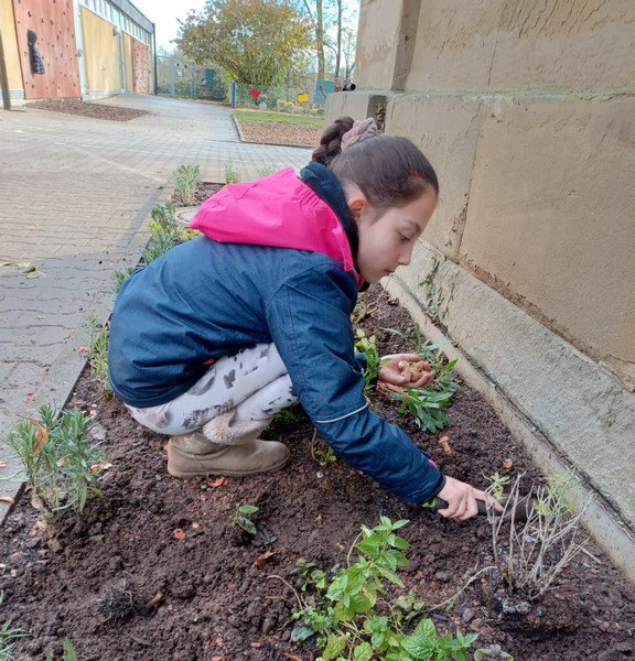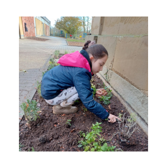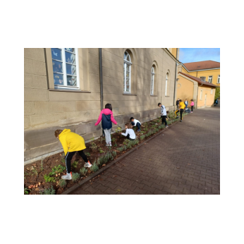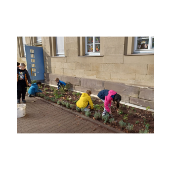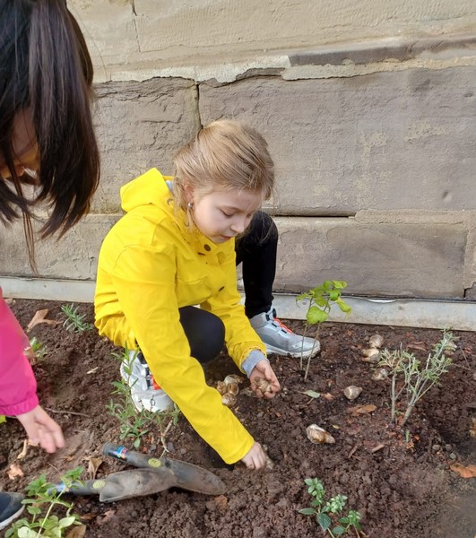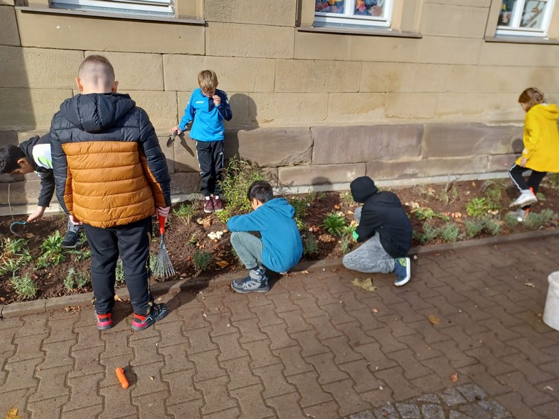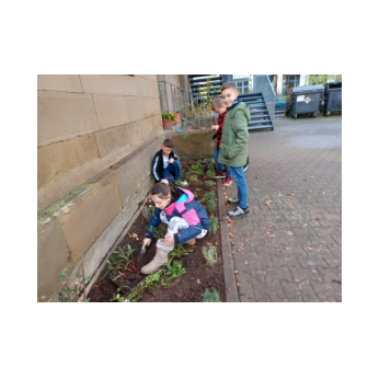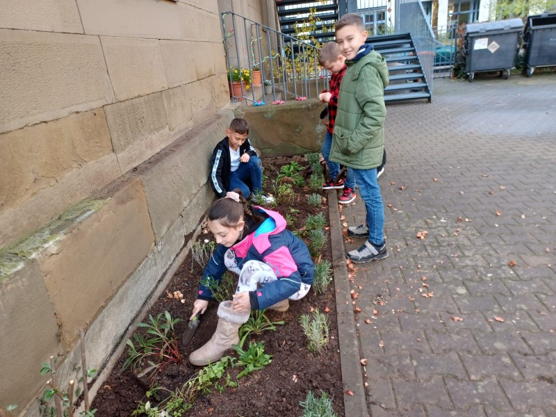 Um im kommenden Frühjahr für reiche Blütenpracht vor unserer Schule zu sorgen, beteiligte sich die Klasse 4b an der Neu-Gestaltung des Beetes vor unserem Schulgebäude und brachte mehrere hundert Blumenzwiebeln von Frühblühern unter die Erde. Wir können den Frühling kaum noch erwarten und freuen uns auf die Blüte von Schneeglöckchen, Krokus, Tulpen, Narzissen und vielen anderen Blumen.