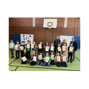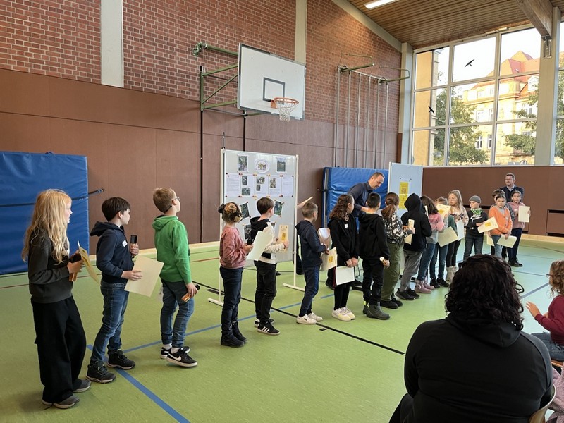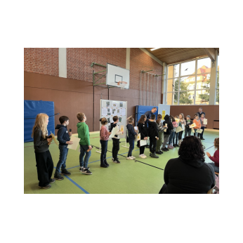 Den dritten Platz belegten Pia Beringer (Gartenstadt-Grundschule) und Philipp Scheungraber (Schiller-Grundschule). Platz zwei ging an Romy Beemüller (Schiller-Grundschule) und Theo Tille (Montessori-Grundschule). Stadtsiegerin bzw. Stadtsieger wurden Lotta Große Ruse (Montessori-Grundschule) und András Nagy-Almásy (Friedrich-Rückert-Grundschule). Alle teilnehmenden Kinder nahmen im Anschluss in der Turnhalle der Friedrich-Rückert-Grundschule ihre wohlverdienten Preise entgegen.Ein großes Dankeschön an alle Helferinnen und Helfer, die zum Gelingen dieses spannenden Nachmittags beigetragen haben. Wir danken der Seminarleiterin Michaela Reif-Schnaidt und ihren Seminaristinnen für die Unterstützung bei der Korrektur der Arbeiten und dem Elternbeirat der Friedrich-Rückert-Grundschule für die leckere Bewirtung. Ebenso unserem Hausmeister Joachim Wüst für Aufbau und Abbau und der VR-Bank Main-Rhön, die auch in diesem Jahr wieder die Sachpreise für die Kinder beisteuerte. Diese wurden von Herrn Peter Suckfüll direkt übergeben.