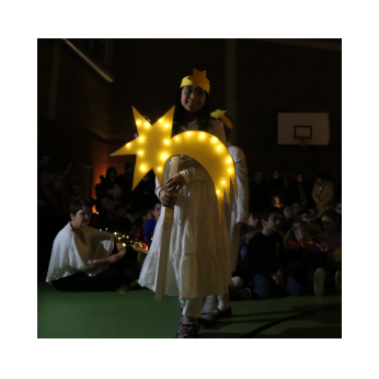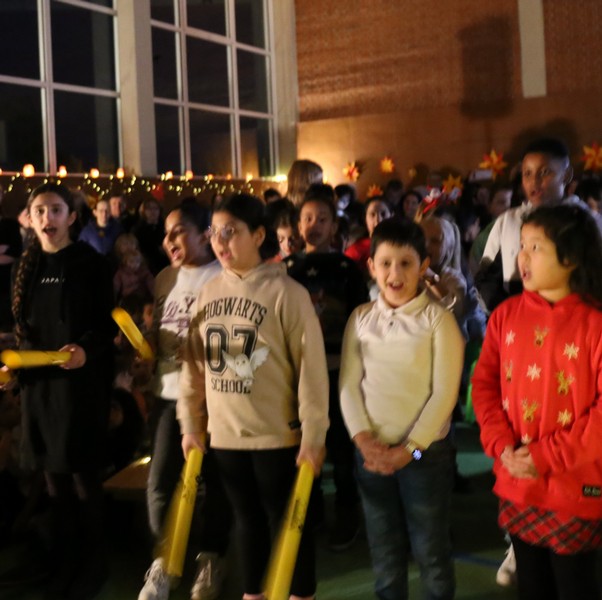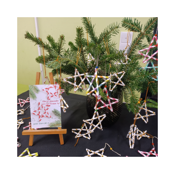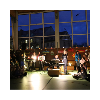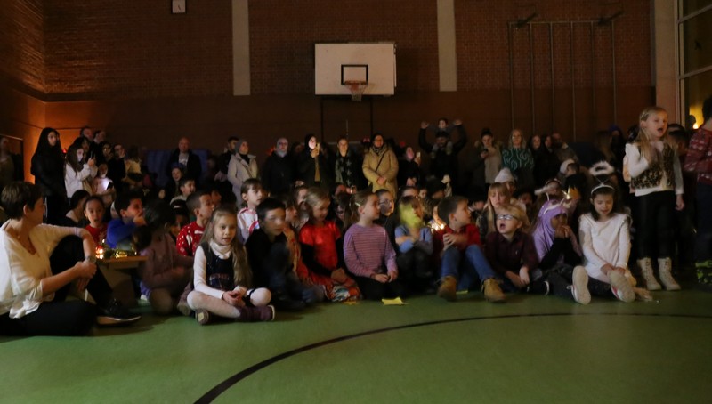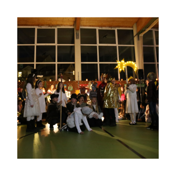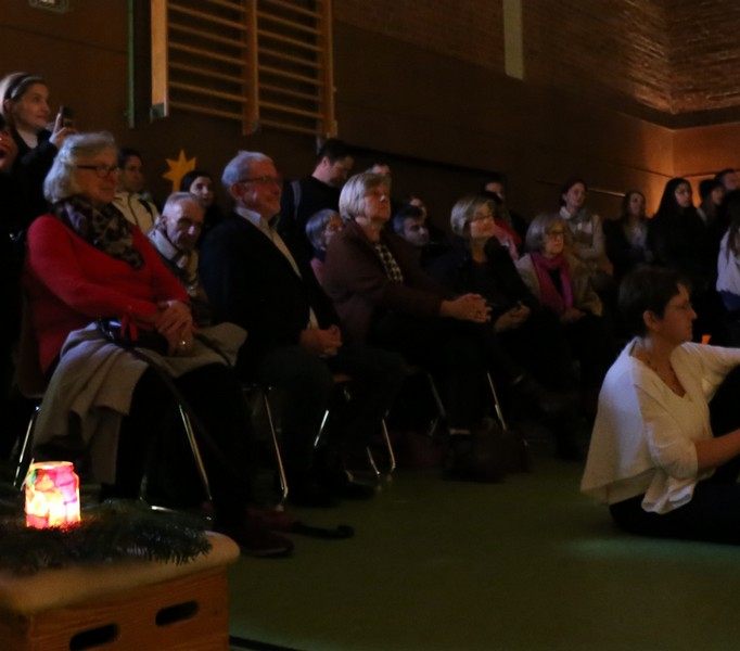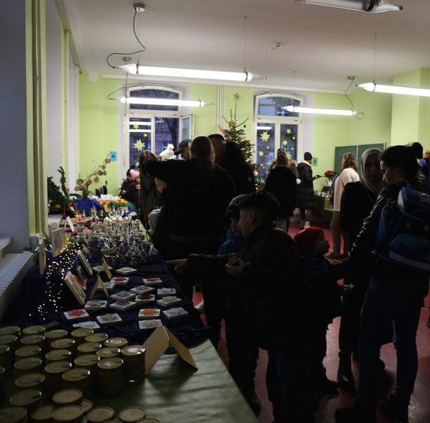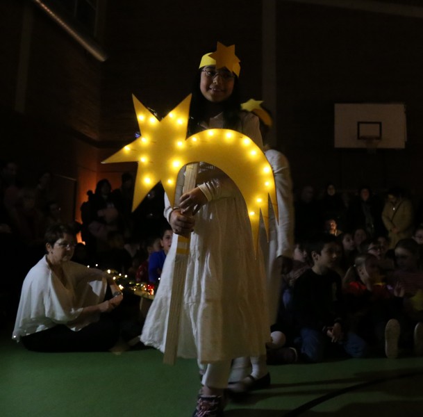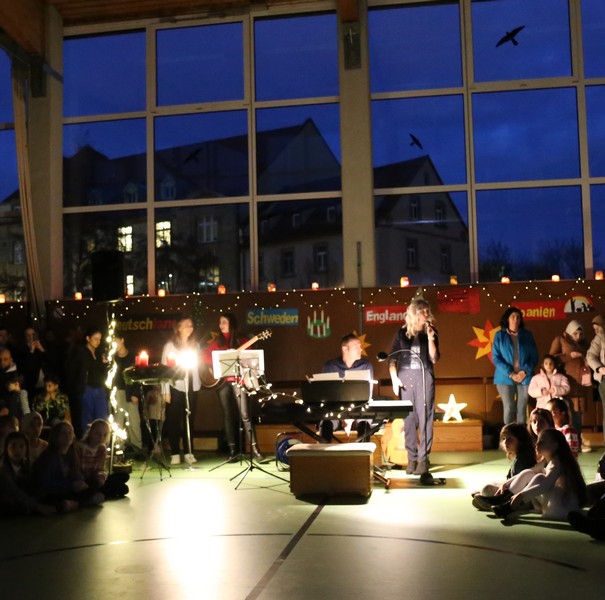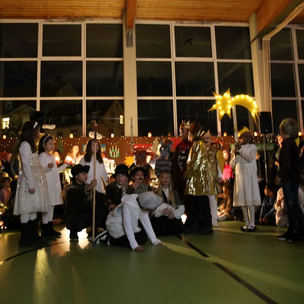 Nachdem im letzten Jahr noch ein kleiner Weihnachtsbasar die Adventsfeier ersetzte, fand er in diesem Jahr im Speisesaal statt. Die Tische waren gefüllt mit zahllosen Bastelarbeiten und kulinarischen Köstlichkeiten wie Schokocrossies und frisch gebackener Waffeln. Der Elternbeirat ergänzte das Angebot durch ein großes Kuchenbuffet mit heißen und kalten Getränken. Nach dem Basarbesuch traf sich die Schulfamilie in der Turnhalle zur Adventsfeier. Rektorin Sabrina Neckov betonte in ihrer Begrüßung die Besonderheit einer solchen Feier, zu der trotz der vielen Kriege und Konflikte in der Welt die Schulkinder mit ihren Familien aus den unterschiedlichsten Kulturen hier zusammenkommen. Ein Zeichen gelebter Toleranz. Auch der kleine Stern ist neugierig, wie Weihnachten bei uns und anderswo gefeiert wird. Er machte sich auf durch verschiedene Länder Europas mit einem kleinen Abstecher nach Brasilien. Auf seinem Weg erhält er Einblick in verschiedene Bräuche und Lieder und darf am Ende seiner Reise beim Krippenspiel der Friedrich-Rückert-Schule mitspielen. Zum Abschluss dankt Frau Neckov allen Kindern, Schulbeschäftigten, dem Lehrerorchester, dem engagierten Elternbeirat , den Lesehelfern und allen Freunden und Förderern unsere Schule für den heutigen Abend, ihr Engagement während des ganzen Schuljahres und wünschte allen schöne Feiertage und/oder erholsame Ferien.