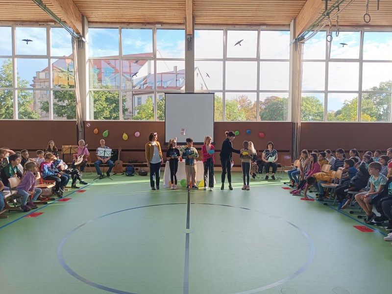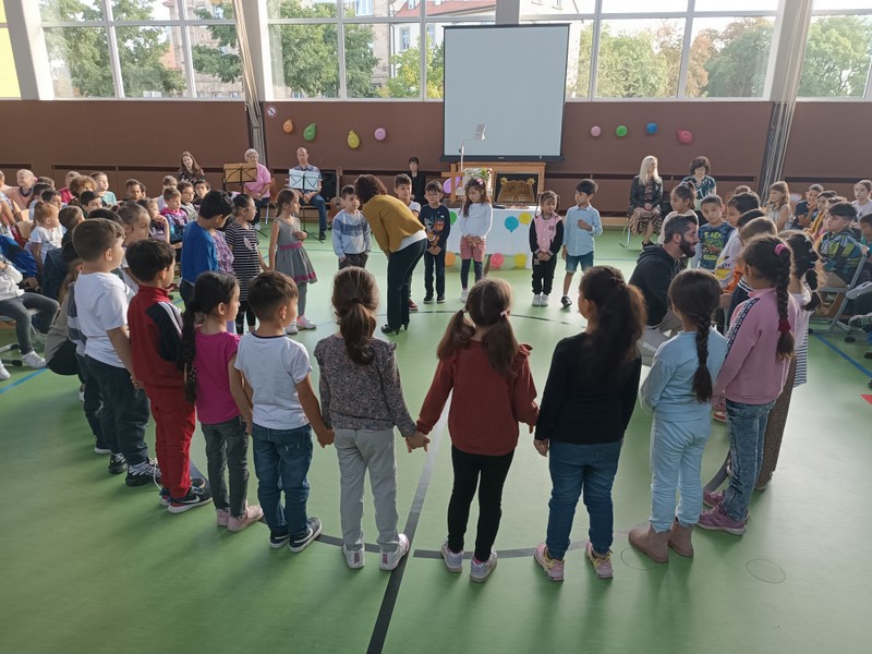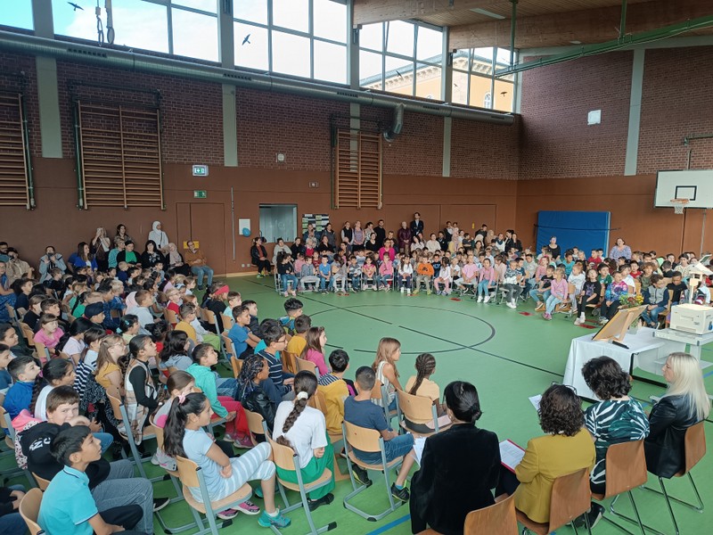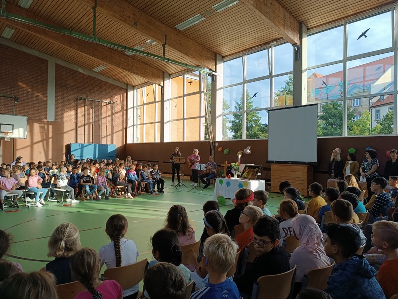 Zur gemeinsamen multireligiösen Anfangsfeier versammelte sich die ganze Schulfamilie dieses Jahr wieder traditionell in der Turnhalle. Rektorin Neckov begrüßte alle Schülerinnen und Schüler, Eltern und Lehrkräfte der Friedrich-Rückert-Schule ganz herzlich und dankte dem bewährten Team unter anderem den Religionslehrerinnen Frau Cetinkaya, Frau Gobs-Knoche und Frau Kneuer für die Vorbereitung, dem Lehrerorchester für die gelungenen musikalische Untermalung und allen Lehrkräften und Kindern, die mit dieser besonderen Feier wieder einmal gezeigt haben, das Lernen und Feiern auch über verschiedene Kulturen und Religionen hinweg möglich ist. In ihrem kleinen Mini-Theaterstück veranschaulichten die Kinder der Klasse 2c wie Streit die Gemeinschaft auseinander bringt, aber auch wie ein gutes Miteinander möglich ist. Anschließend wurden die neuen Erstklässler mit dem Segen Gottes, dem Zuspruch Allahs oder einem guten Wunsch in der Schulgemeinschaft begrüßt.