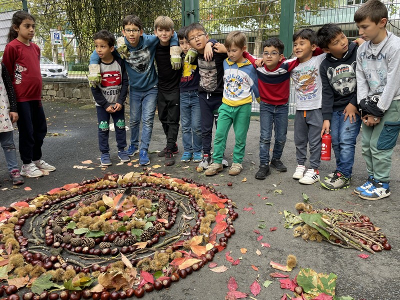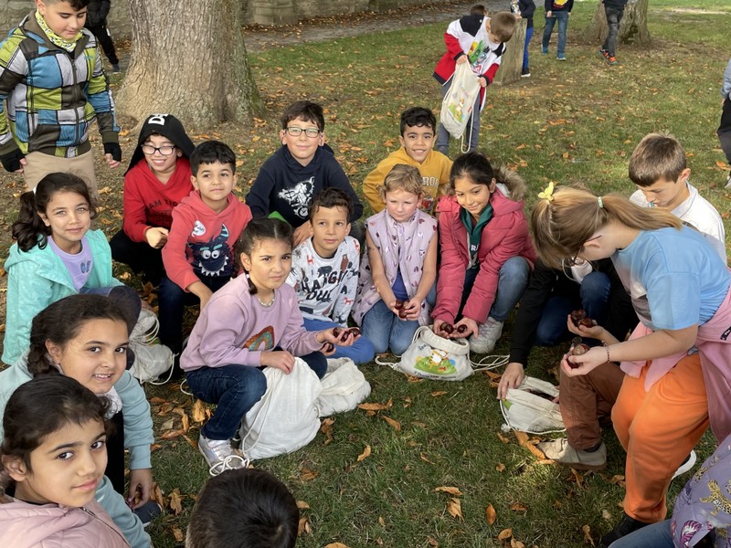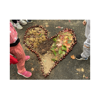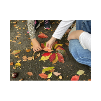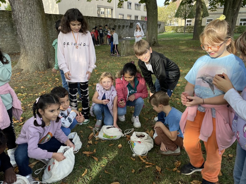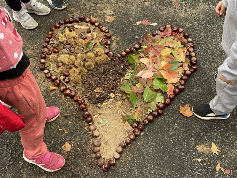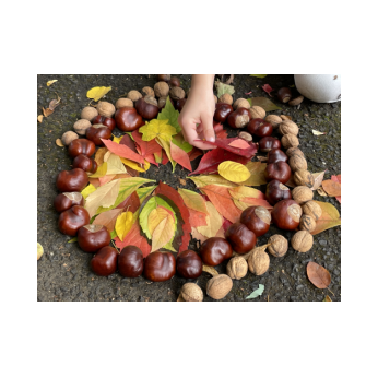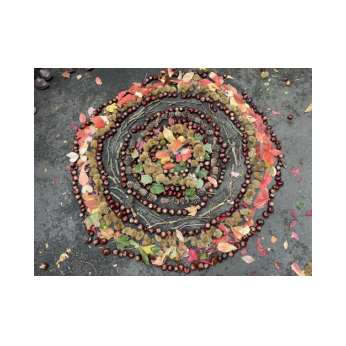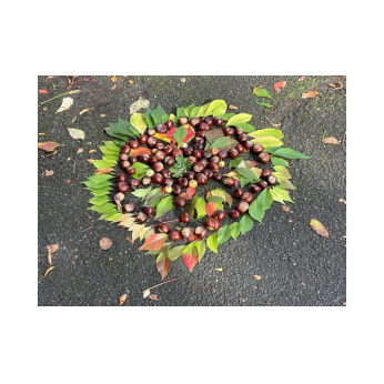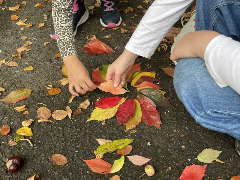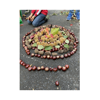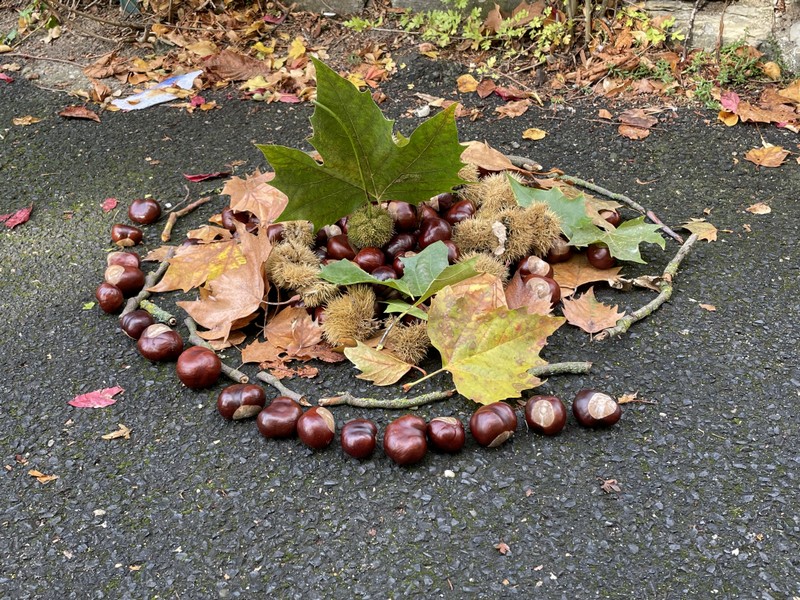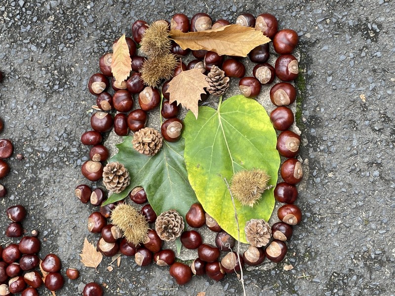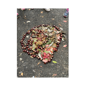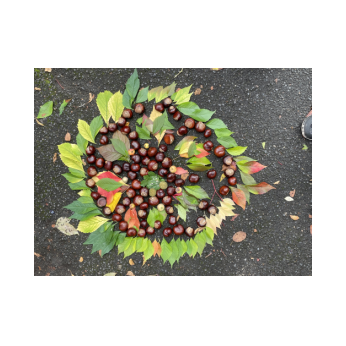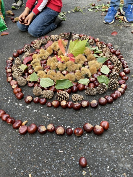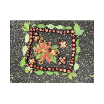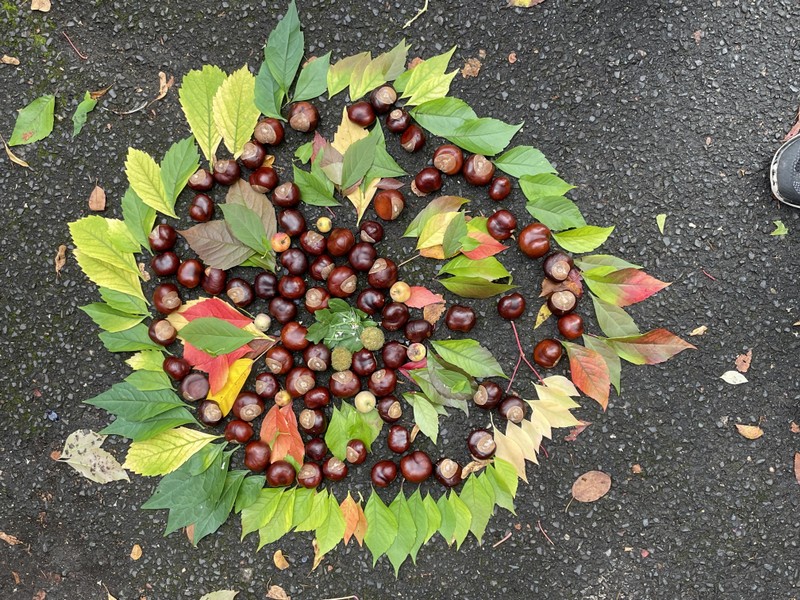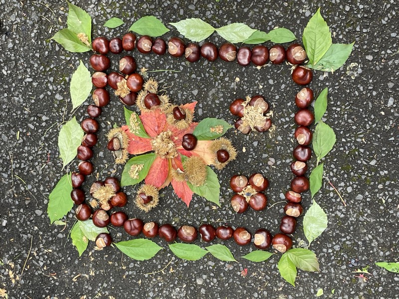 Ab der zweiten Pause waren plötzlich wunderbare Kunstwerke im Pausenhof unserer Friedrich-Rückert-Grundschule zu entdecken. Wie kam es dazu? Am Morgen sammelten die Kinder der Klassen 1c und 3c außerhalb des Schulgeländes Blätter, Gräser, Kastanien, Zweige…