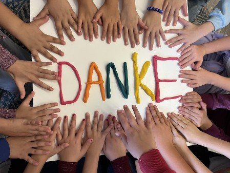 Knete für alle - einen ganzen Berg bunter Knete hatte Stefan Labus für die Kinder der Friedrich-Rückert-Schule zum Weltkindertag im Gepäck. Die Kinder der Klasse 2b bedankte sich im Namen aller Schulkinder mit einem Danke-Plakat.