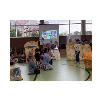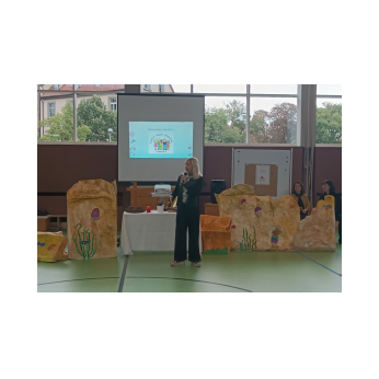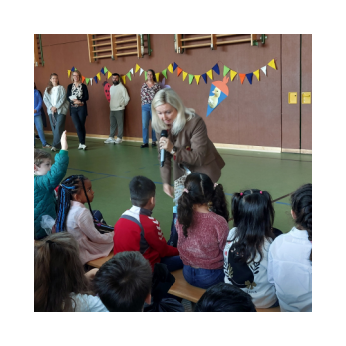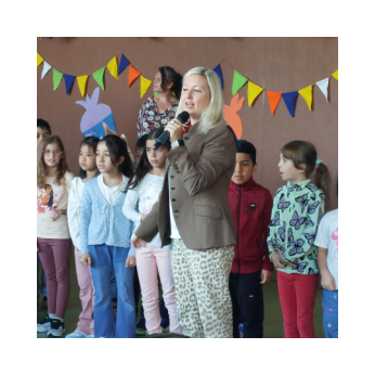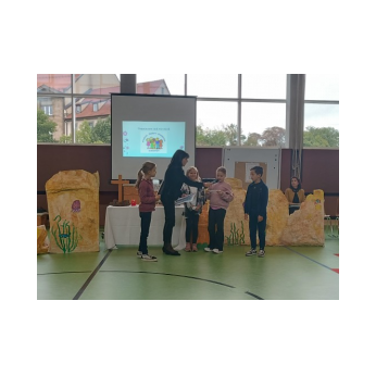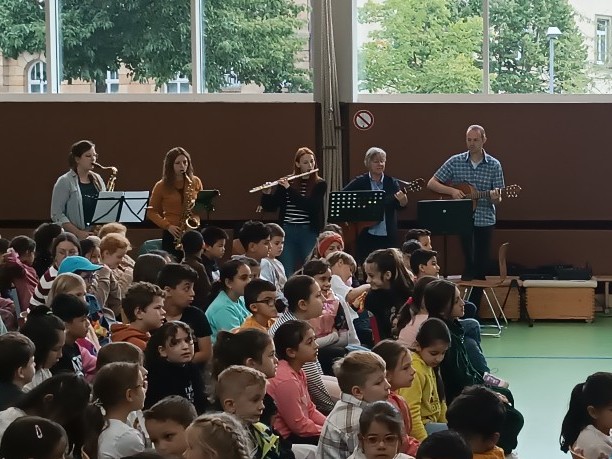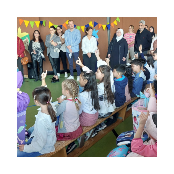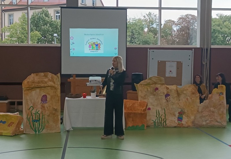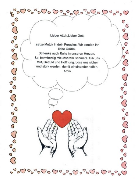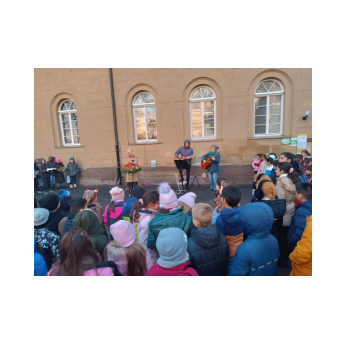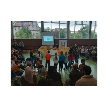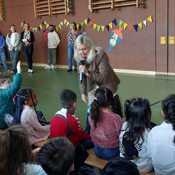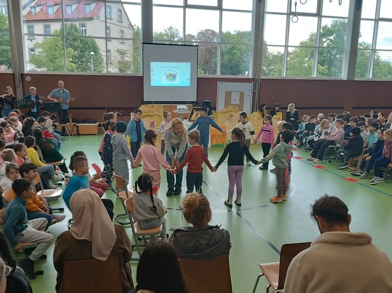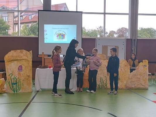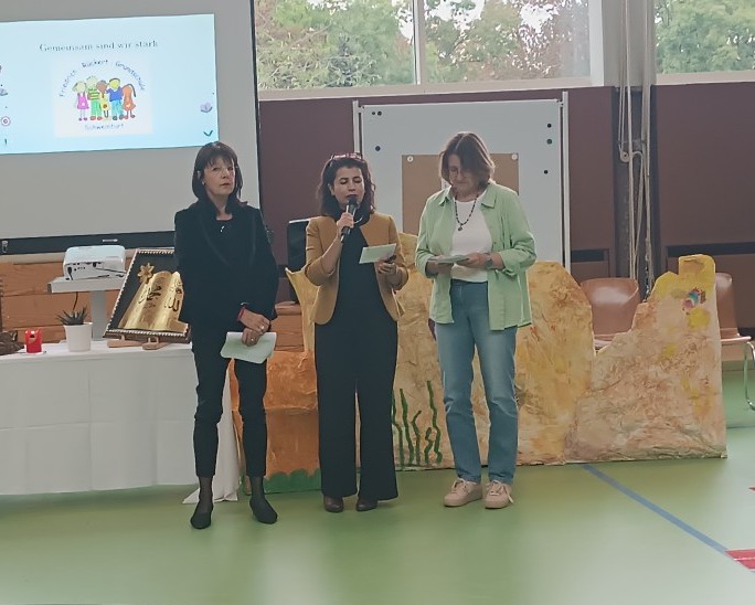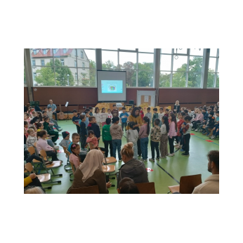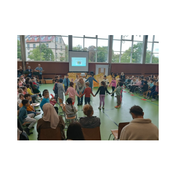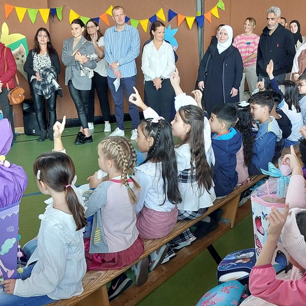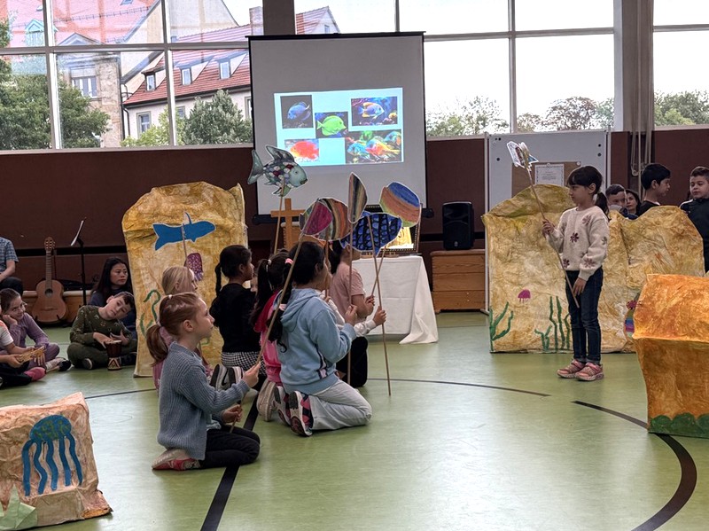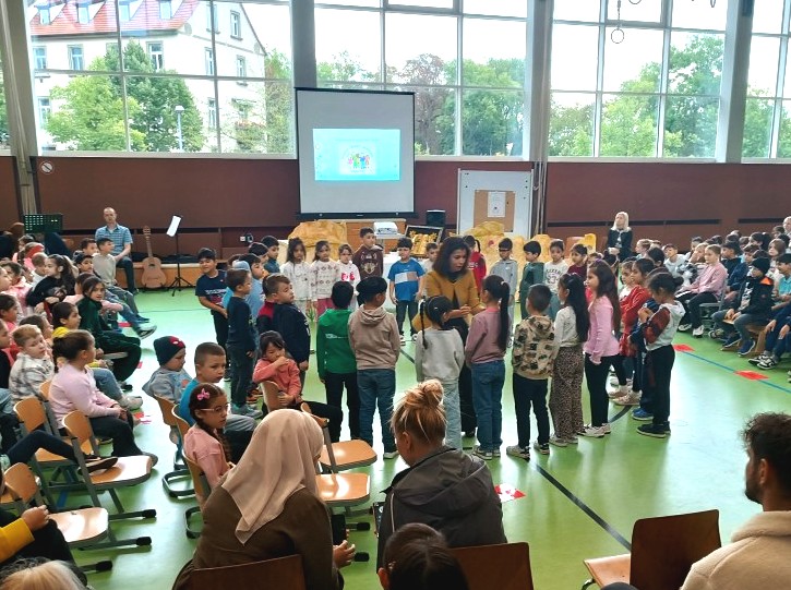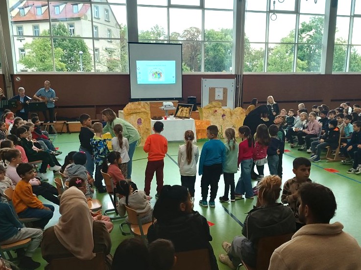 Gemeinsam ist es leichter, schwere und traurige Zeiten zu durchstehen. So erinnerte Schulleiterin Sabrina Neckov zu Beginn mit einfühlsamen Worten an Malak und sprach zusammen mit Frau Cetinkaya für sie ein Gebet. Gemeinsam kann man gefährliche Abenteuer bestehen. Nur mit seinen Freunden konnte der Regenbogenfisch den kleinen Fisch vor dem Räuberfisch retten, wie die Kinder der Klasse 2c in ihrem Mini-Theaterstück vorführten. Zum Zeichen, dass auch wir an unserer Schule zusammengehören und gemeinsam viel bewegen können, fassten sich alle an den Händen. Die superlange Kette machte deutlich: "Du bist nicht allein! Gemeinsam sind wir stark!" Anschließend wurden alle neuen Erstklässler von ihrer Religions- bzw. Ethiklehrerin in den Kreis gerufen und mit dem Segen Gottes, dem Zuspruch Allahs oder einer herzlichen Begrüßung an der Friedrich-Rückert-Schule willkommengeheißen. Auch sie sind nicht allein, bei ihrem Start in den neuen Lebensabschnitt, sondern herzlich aufgenommen in der Rückert-Schulfamilie. Nach den Fürbitten vorgetragen von Kindern der 3. und 4. Klasse endete die Anfangsfeier mit dem Lied "Aufstehen, aufeinander zugehen!", das ebenfalls dazu aufruft, gemeinsam durchs Leben zu gehen. Wie jedes Jahr gelang es unsere Rückert-Lehrerband einen festlichen und feierlichen Rahmen zu gestalten, der Kinder und Erwachsene gleichermaßen beeindruckte.