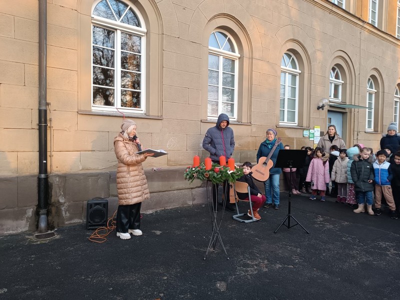 Immer montags versammmlen sich alle Klassen im Pausenhof, um gemeinsam die Kerzen am Adventskranz anzuzünden, Lieder zu singen und einer Adventsgeschichte zu lauschen, die traditionell von Rektorin Sabrina Neckov vorgetragen wird.