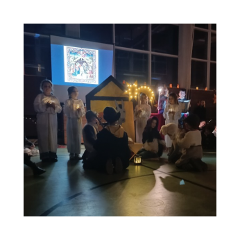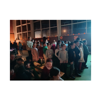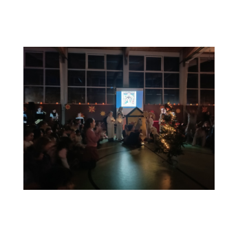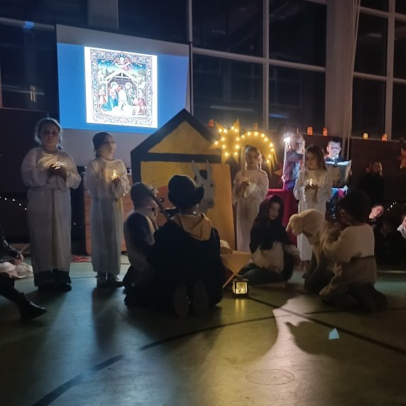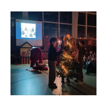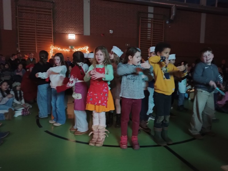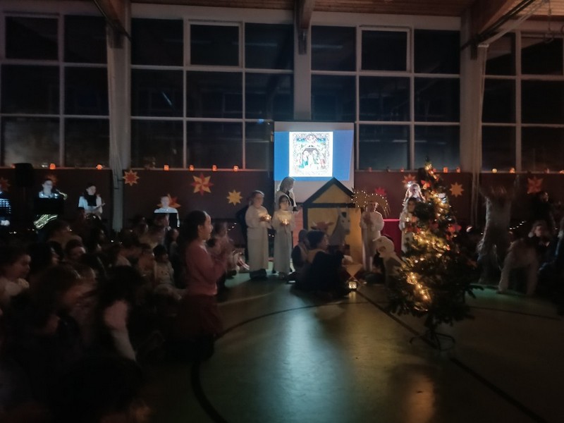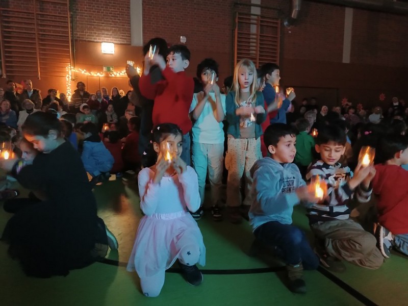 Zwei Kinder finden auf dem Dachboden der Schule ein dickes Buch mit vielen Weihnachtsbräuchen. So erfahren die Zuschauer ganz anschaulich jede Menge darüber, wie Weihnachten entstanden ist: moderne und alte Lieder wie die "Weihnachtsbäckerei" (2a/b) und "Gloria" (1c/3c), Gedichte wie "Die Weihnachtsmaus" (3a/b/c) und "Was unter dem Weihnachtsbaum liegt"(4a/b/c) sowie ein Lichtertanz (1b/2c), professionell musikalisch begleitet von unserer FRS-Band. Kinder der Klasse 1a schmückten einen Weihnachtsbaum und die Klasse 2a stellte die Weihnachtsgeschichte als Krippenspiel dar. Aber nicht die Plätzchen, nicht die Lichtertänze, nicht die Weihnachtsbäume sind das Wichtigste an Weihnachten: sondern die Frohe Botschaft von der Geburt Jesu. "Das besondere dieser Feier ist die Tatsache, dass hier verschiedene Nationen, Religionen und Kulturen gemeinsam Weihnachten feiern, so wie auch dieses Jahr wieder Iftar, das muslimische Fastenbrechen," fasste Rektorin Sabrina Neckov die besondere weihnachtliche Stimmung des Abends zusammen und dankte allen Mitwirkenden für die aufwendige und sehr gelungene Vorbereitungen.